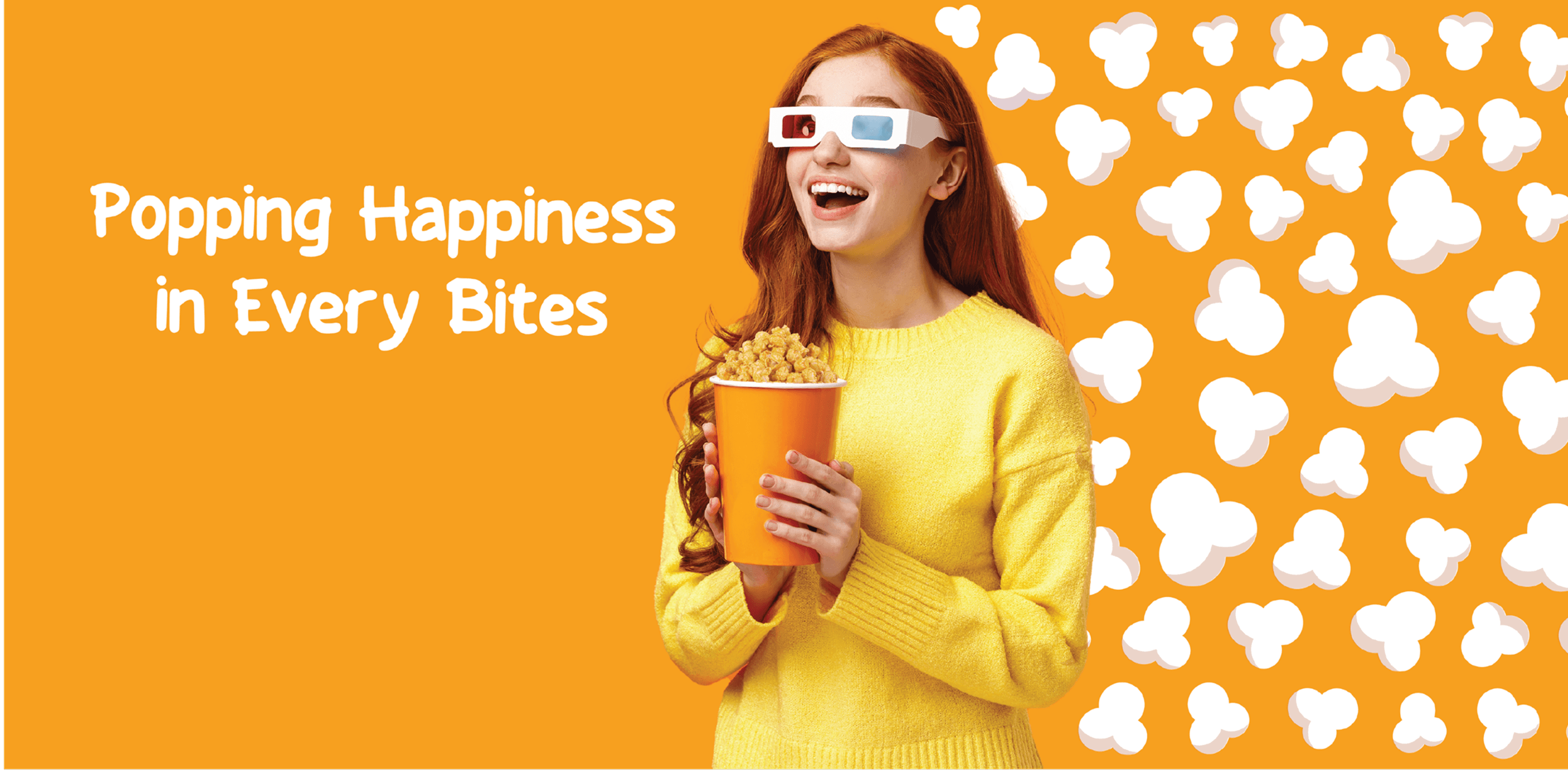 A cute, playful popcorn character with a cheerful expression, bright colors, and a friendly, fun personality.